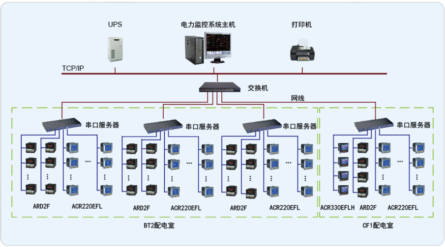 整個系統(tǒng)采用分層分布式結(jié)構(gòu),主控層監(jiān)控主機(jī)位于BT2值班室內(nèi),各變電所間隔層配電柜內(nèi)安裝有本公司ACR220EFL多功能儀表、ACR220EFLH多功能儀表、ARD2F電動機(jī)保護(hù)器,共計(jì)500多回路。BT2/CF1配電室內(nèi)各儀表通過RS485總線連接至通訊管理層的串口服務(wù)器NPORT5610-16,再通過串口服務(wù)器將數(shù)據(jù)上傳至到主控層電力監(jiān)控系統(tǒng)。