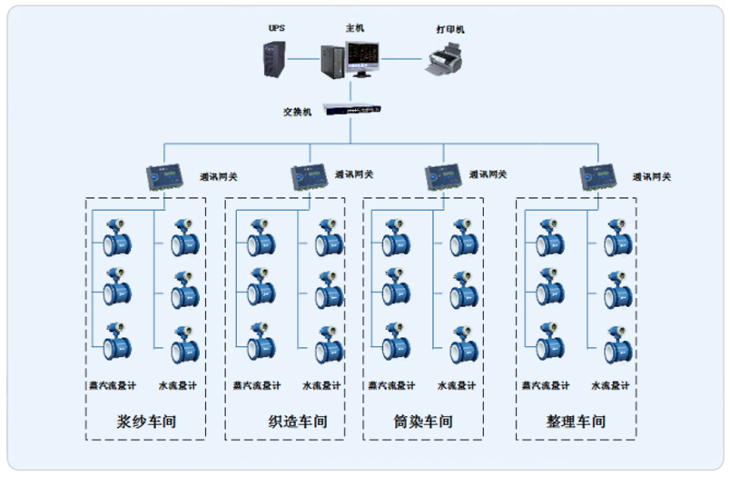 系統(tǒng)采用Acrel-5000型能耗監(jiān)測(cè)系統(tǒng),整個(gè)系統(tǒng)采用網(wǎng)絡(luò)分布式結(jié)構(gòu),監(jiān)控主機(jī)位于現(xiàn)場(chǎng)數(shù)據(jù)機(jī)房中,現(xiàn)場(chǎng)主要監(jiān)測(cè)儀表為水、蒸汽的流量計(jì),位于現(xiàn)場(chǎng)4個(gè)生產(chǎn)車間內(nèi)。該項(xiàng)目實(shí)現(xiàn)了常州強(qiáng)聲紡織有限公司內(nèi)能源的智能管理。所有監(jiān)控設(shè)備均通過屏蔽雙絞線至各自車間內(nèi)的通訊管理機(jī),再通過光電轉(zhuǎn)換器經(jīng)過光纖將數(shù)據(jù)傳輸至數(shù)據(jù)中心,從而實(shí)現(xiàn)遠(yuǎn)程監(jiān)控。