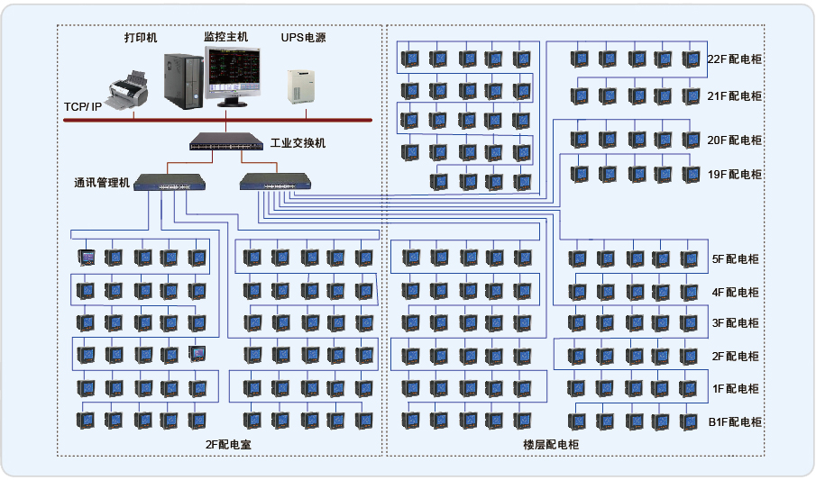 上海百樂門大酒店電力監(jiān)控系統(tǒng)監(jiān)控范圍為百樂門大酒店的22個樓層的PZ系列電力儀表和配電室的PZ、ACR系列電力儀表進行遠程監(jiān)測。現(xiàn)場設備全集中在同一個配電室中,業(yè)主的電氣值班室就近安排在配電室旁,本系統(tǒng)監(jiān)控中心也安置在該值班室中。系統(tǒng)組網(wǎng)采用常見的3層結構,站控管理層、通訊管理層和現(xiàn)場設備層。