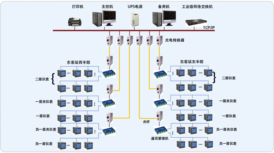 成都東客站電能管理系統(tǒng)采用雙機(jī)服務(wù),位于東客站一層西南角值班中心,同時(shí)該系統(tǒng)配有6臺(tái)管理機(jī),根據(jù)現(xiàn)場儀表的分布范圍,合理的分配6臺(tái)管理機(jī)的管理范圍;為保障數(shù)據(jù)傳輸?shù)膶?shí)時(shí)性和穩(wěn)定性,均采用光纖進(jìn)行數(shù)據(jù)上傳。在值班室對管理機(jī)上傳的數(shù)據(jù)進(jìn)行多樣式表現(xiàn)方式,畫面比較形象直觀;系統(tǒng)同時(shí)具備向BA系統(tǒng)轉(zhuǎn)發(fā)數(shù)據(jù)的功能。