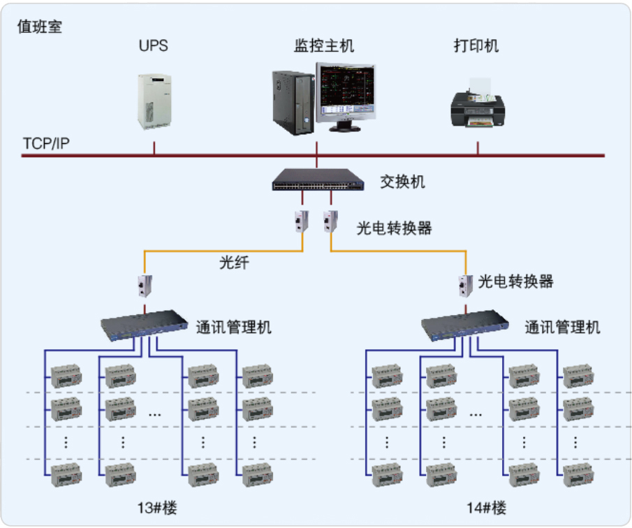 該項目有兩棟樓,均為六層,一共有532個房間,其中13#棟彝學院289個房間,14#棟藏學院243個房間,采用我司ADF100單相多用戶電能表195個,分為24條RS485總線接至通訊管理機,通訊管理機通過光纖拉至值班室連接到Acrel-3000預付費電能管理系統后臺,實現總線上儀表與監控主機的數據連通。該系統為學校宿舍項目解決用電問題提供了真實可靠的依據,取得了較好的管理水平。