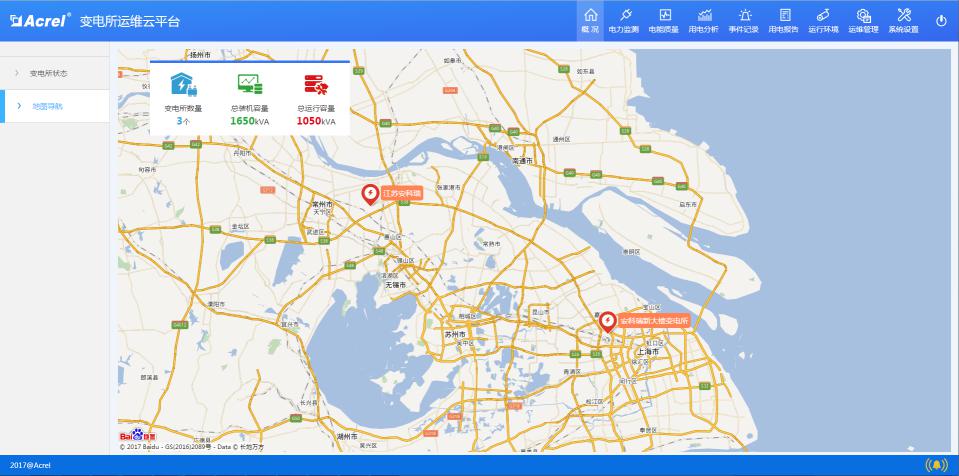 結(jié)合電子地圖顯示變電所的分布情況,并匯總變電所數(shù)量、累計(jì)裝機(jī)容量、累計(jì)運(yùn)行容量等信息,提供查看對(duì)應(yīng)變電所詳細(xì)信息的入口。