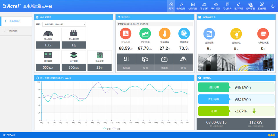 統(tǒng)總覽從平臺(tái)概況、運(yùn)行狀態(tài)、用能分析、當(dāng)日事件等維度展示數(shù)據(jù),使用戶從全局上輕松掌握各站所及監(jiān)測(cè)點(diǎn)的情況,及時(shí)采取相應(yīng)應(yīng)對(duì)措施。