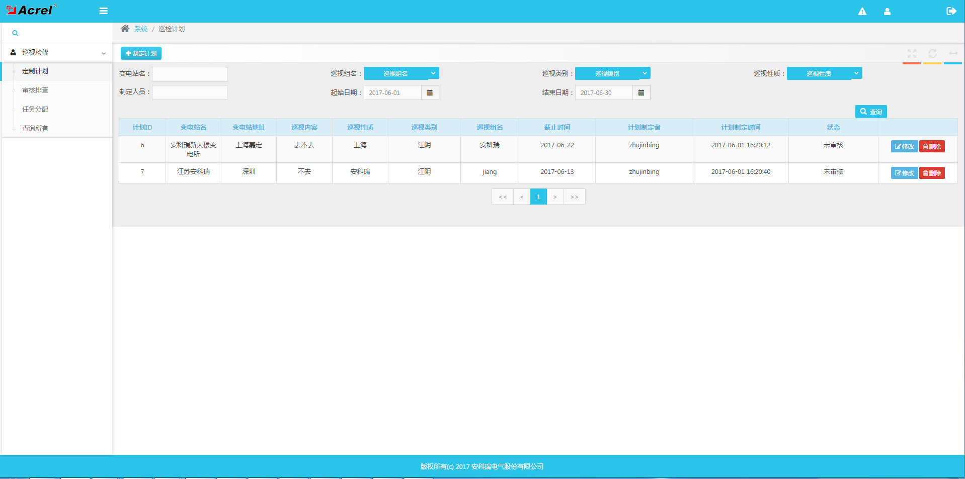 提供巡檢計(jì)劃編制,經(jīng)審核后生成巡檢任務(wù)推送到巡檢人員的手機(jī)上,巡檢人員執(zhí)行巡檢任務(wù)并登記巡檢內(nèi)容;平臺(tái)可提供數(shù)據(jù),供運(yùn)維參考,為巡檢提供便利。